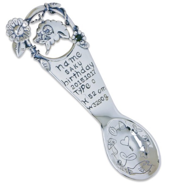 シルバーのベビースプーン お食い初めやメモリアルギフトに インテリアとしても飾れるケース付き □ スプーン大きさ □ 全長:8.5cm 幅:2cm ・名前,生年月日,血液型,身長体重,誕生時間,をローマ字大文字数字で刻印いたします。 (血液型は調べない方はわからないので空欄になりますがわかり次第お送りいただければ後日でも無料で刻印いたします) △ 誕生石 △ 誕生月の誕生石をお留め致します。 ※Gは合成石 10月トルマリンは男の子はグリーン女の子はピンクが留まります。 〇 生まれ年の干支チャーム 〇 スプーン上部に生まれ年干支チャームをお付けします。 ● 飾り用BOXケース付き ● ベビースプーンケース □ ケースの大きさ □ 横:17.2㎝ 厚さ:3.6㎝ 「ケース背景色を青orピンクor緑or黄色から選択ください。」 〇 ラッピング 〇 ベビーギフトはご自宅用もギフトラッピングにて発送いたします ※リボンの色は時期により違うことがございます。 ◎ 納期や注文方法について ◎ ※こちらはオーダー商品の為在庫の有無にかかわららず商品お届けまで3週間頂いておりますのでご了承ください。