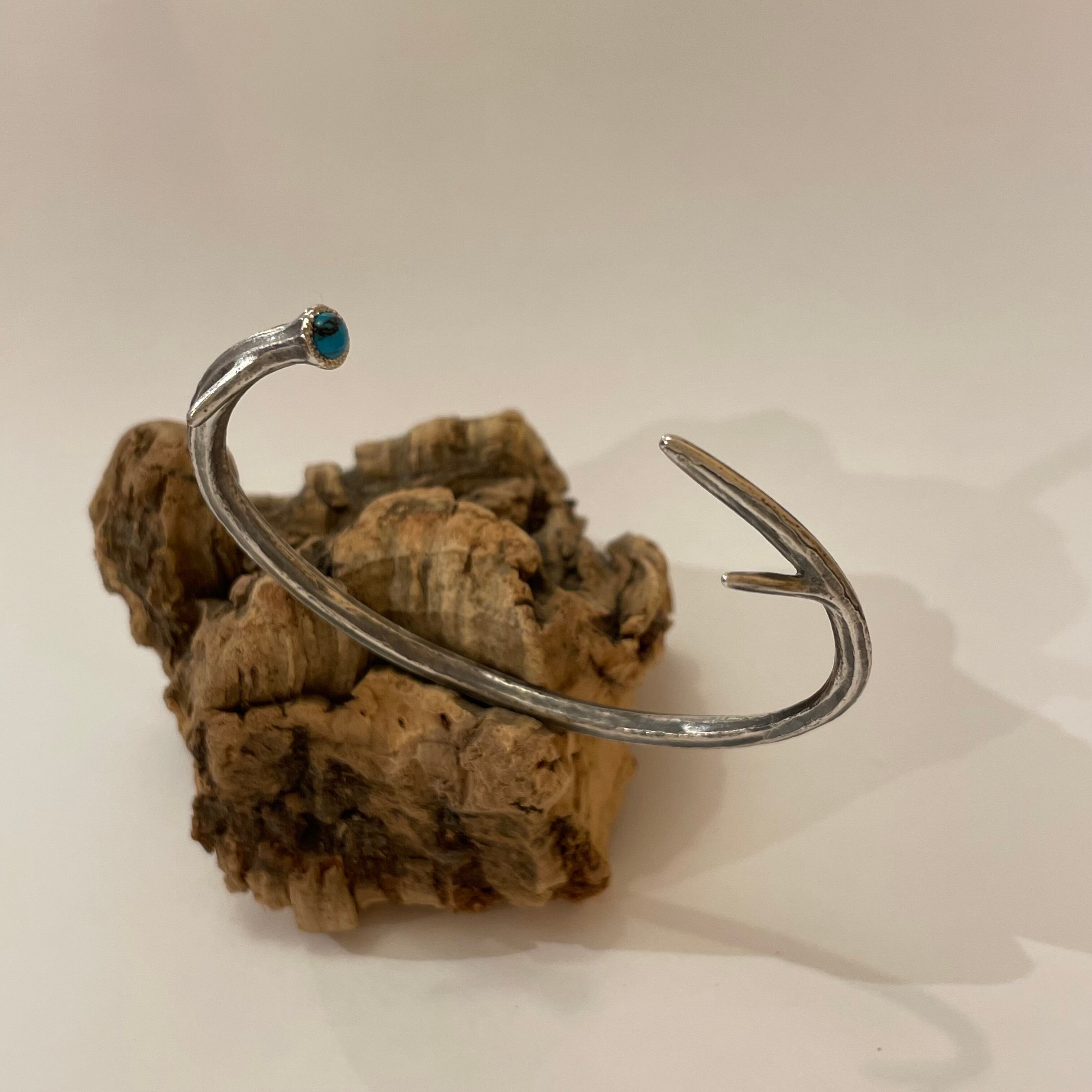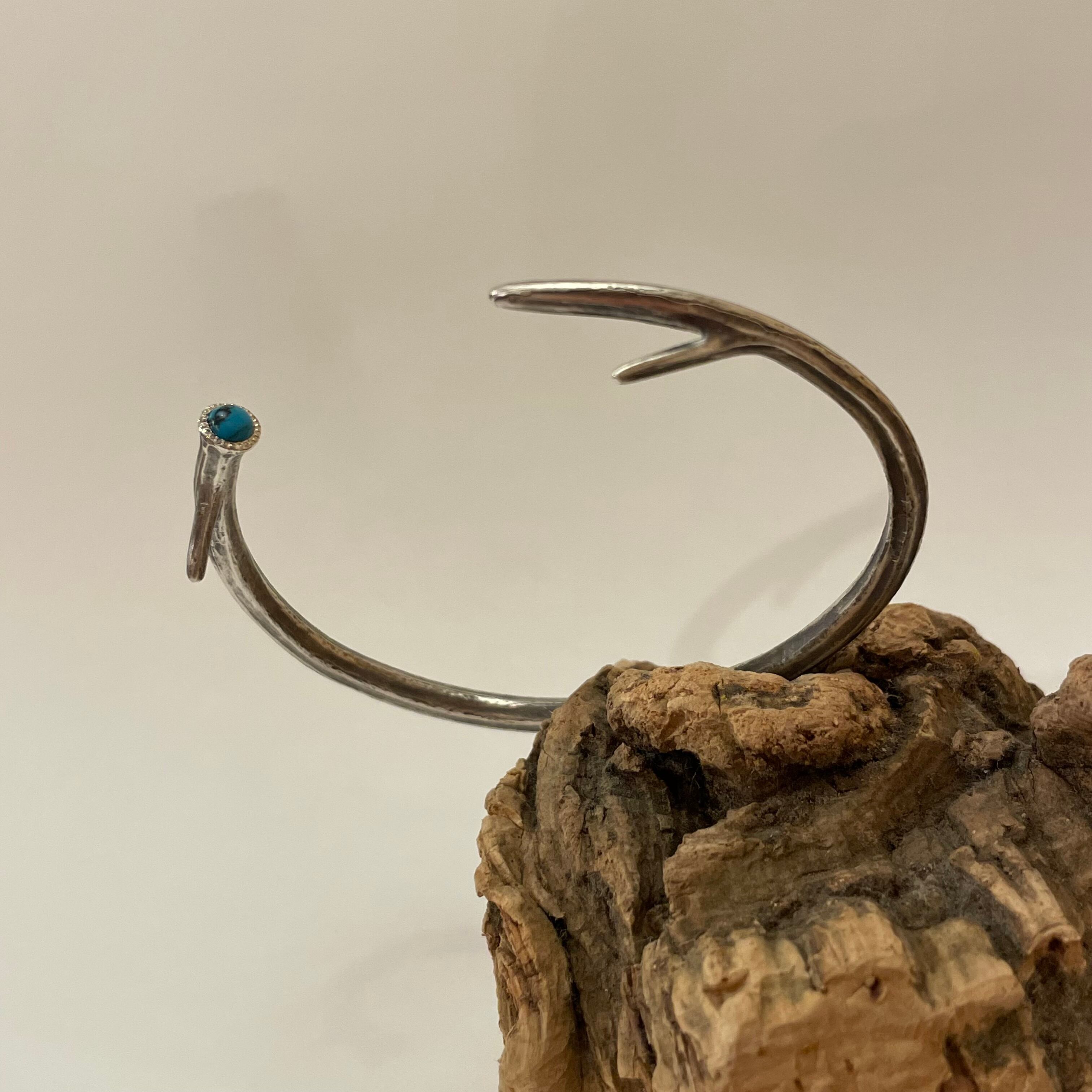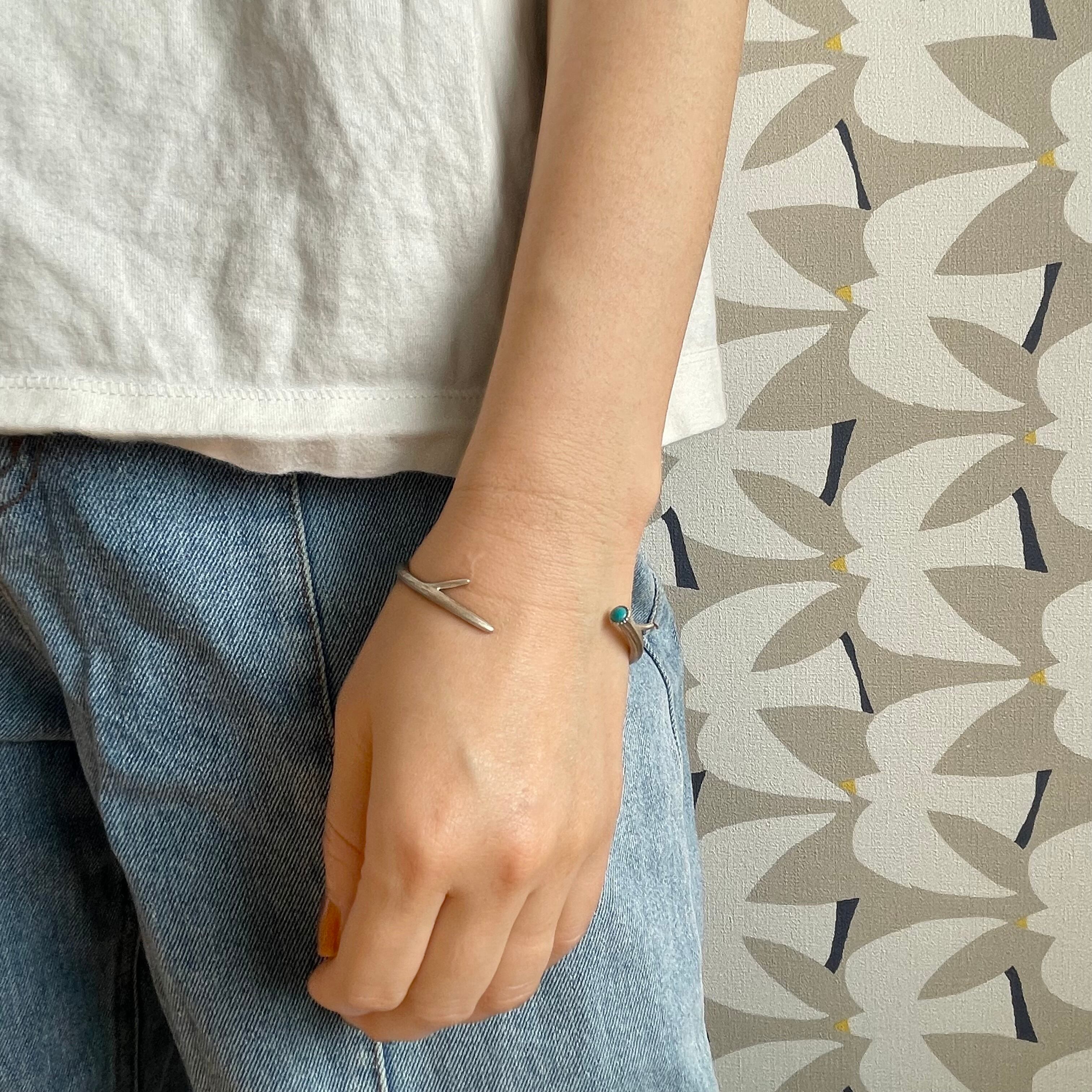 シンプルなバングルにワンポイント、ターコイズが端に留まっています。バングルはフリーサイズです。