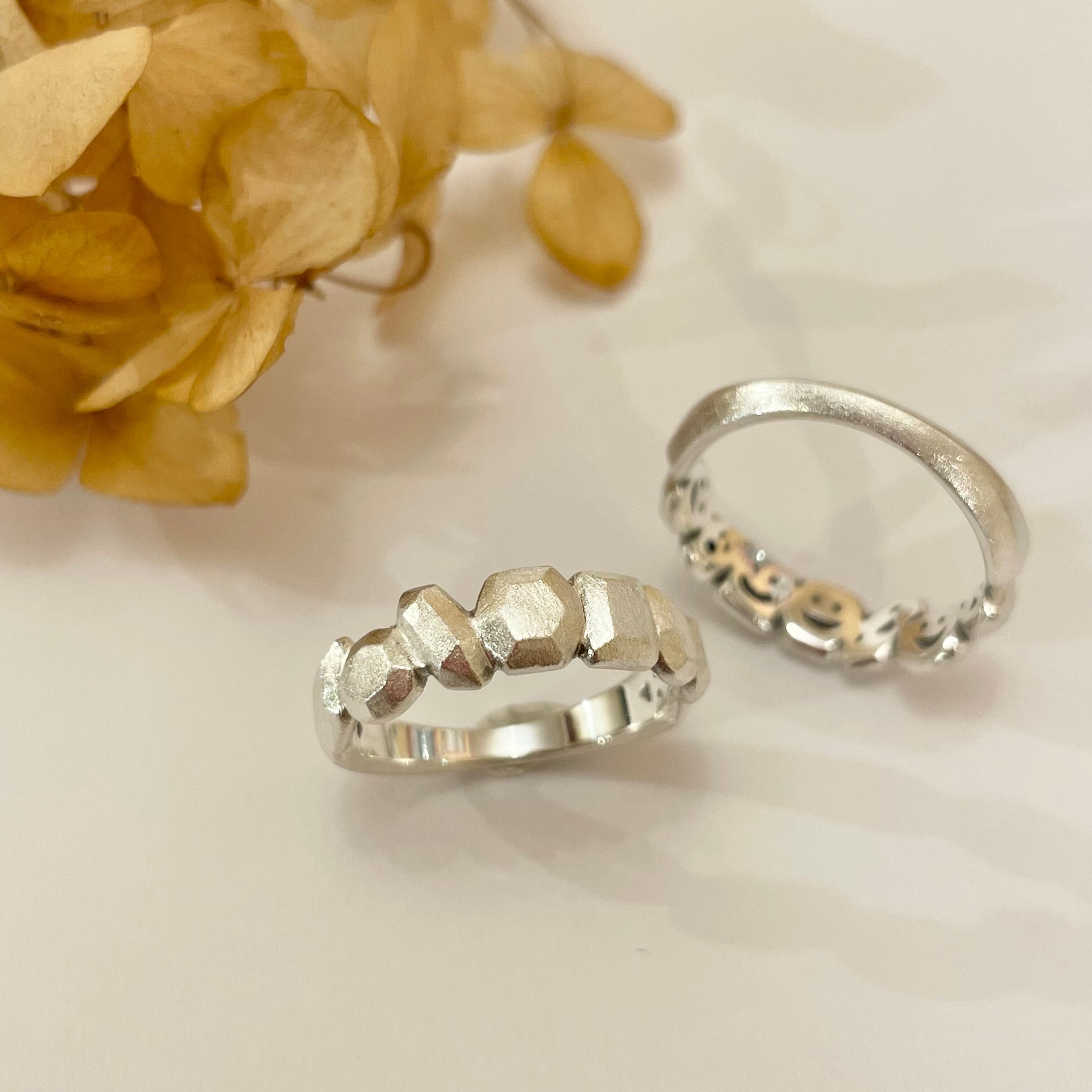 リングの裏側にたくさんの笑い顔が彫られています。