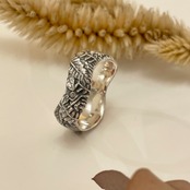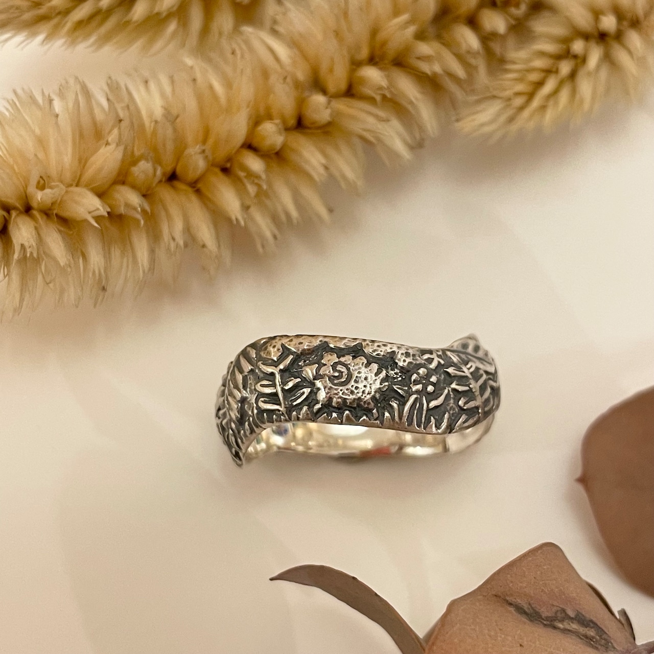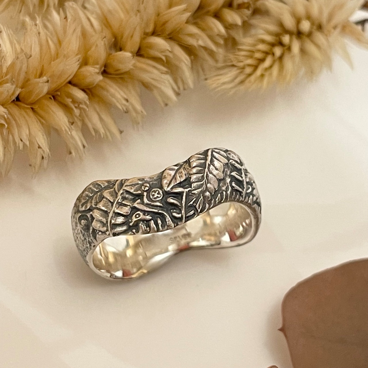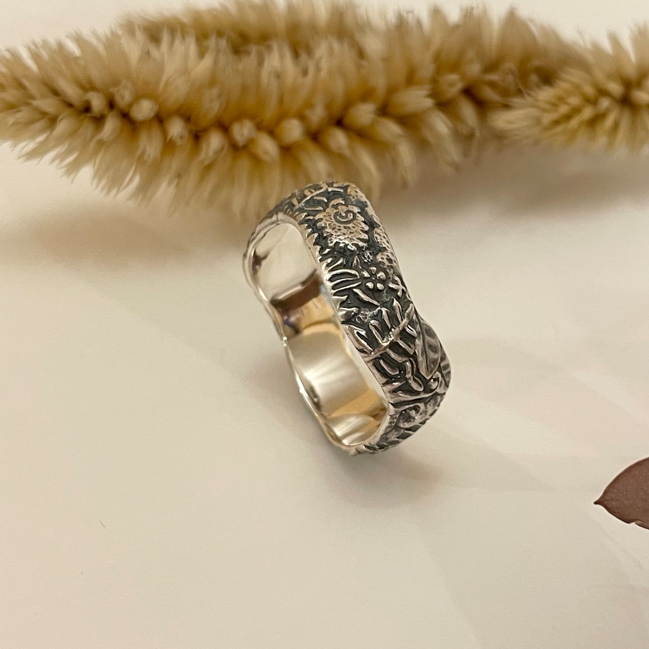 羊のコトロを中心に広がる森の中にはハナツムリも彫り込みました。