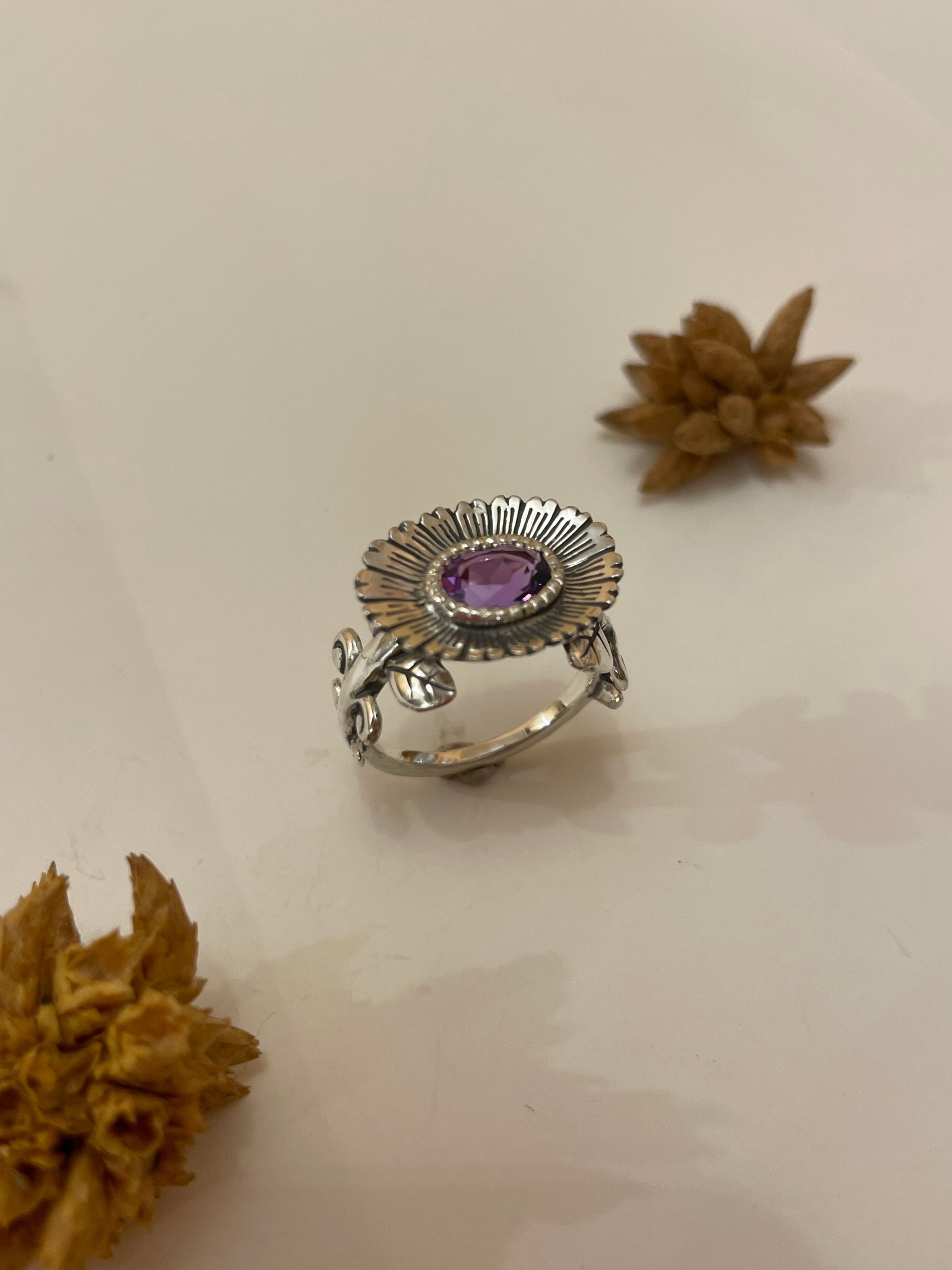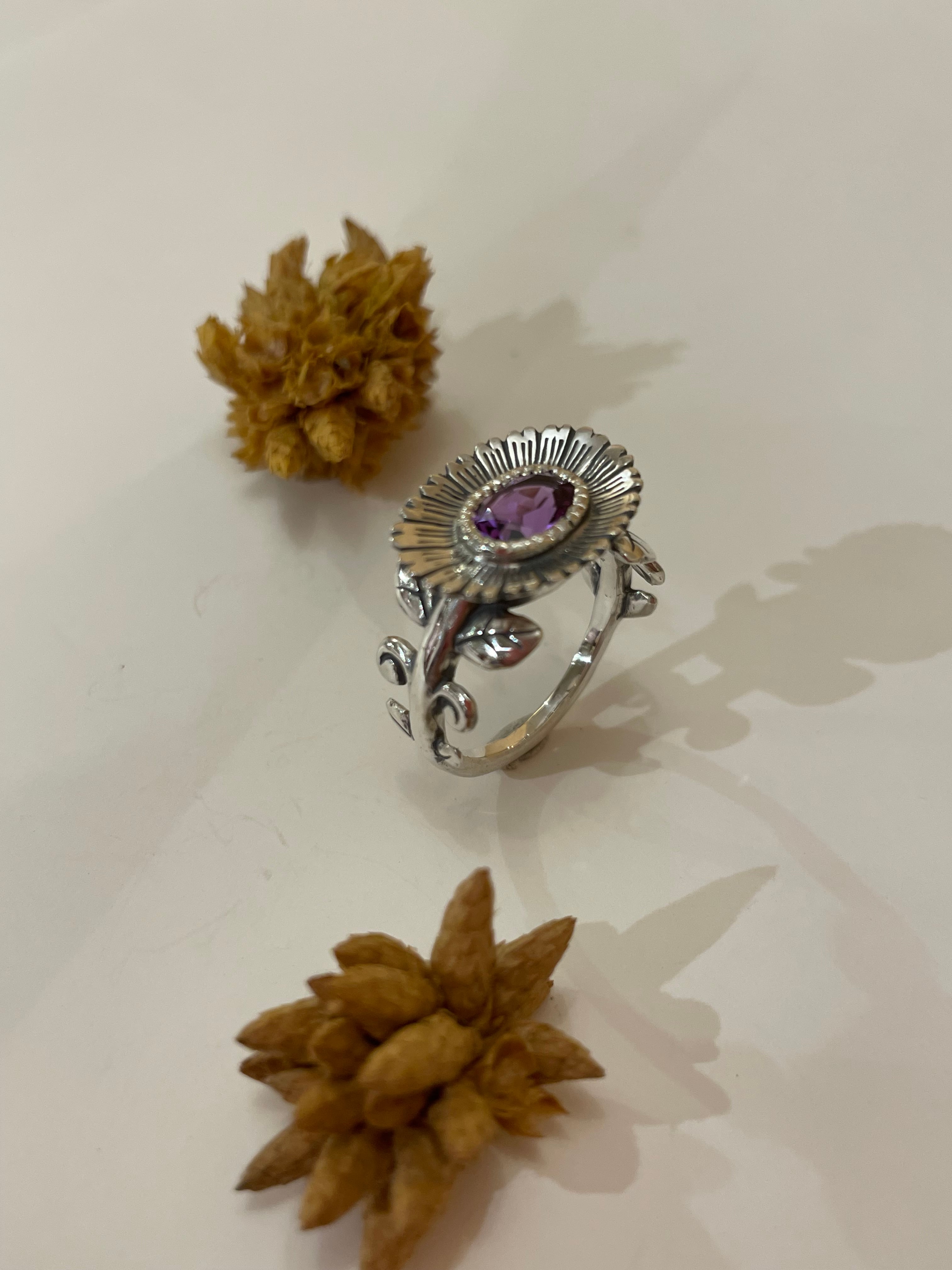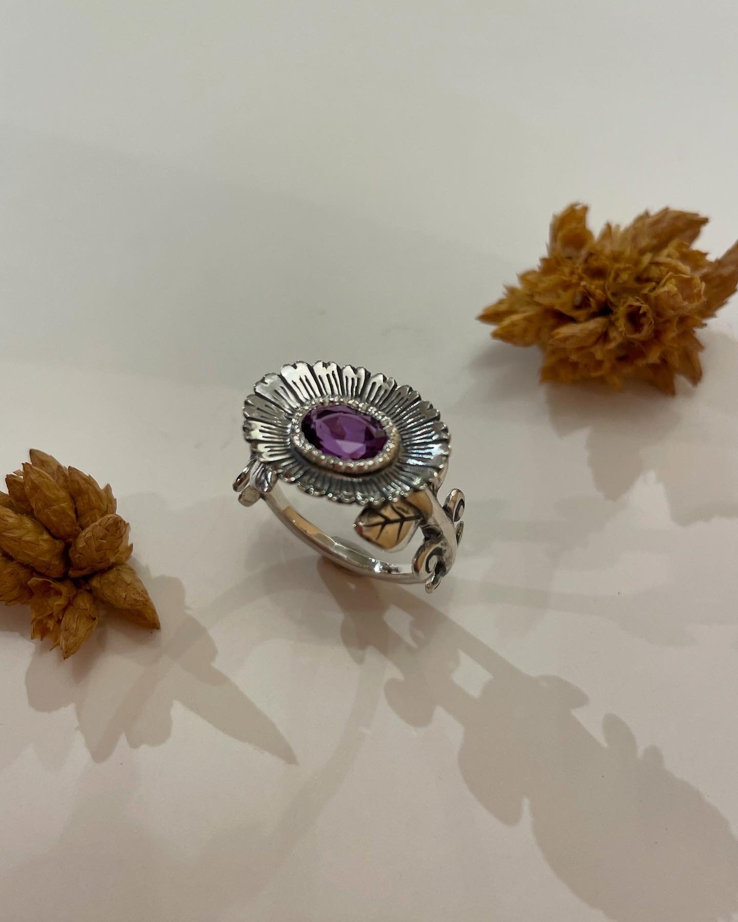 オーバルカットのコランダムがとまる楕円のお花が珍しいデザインです。