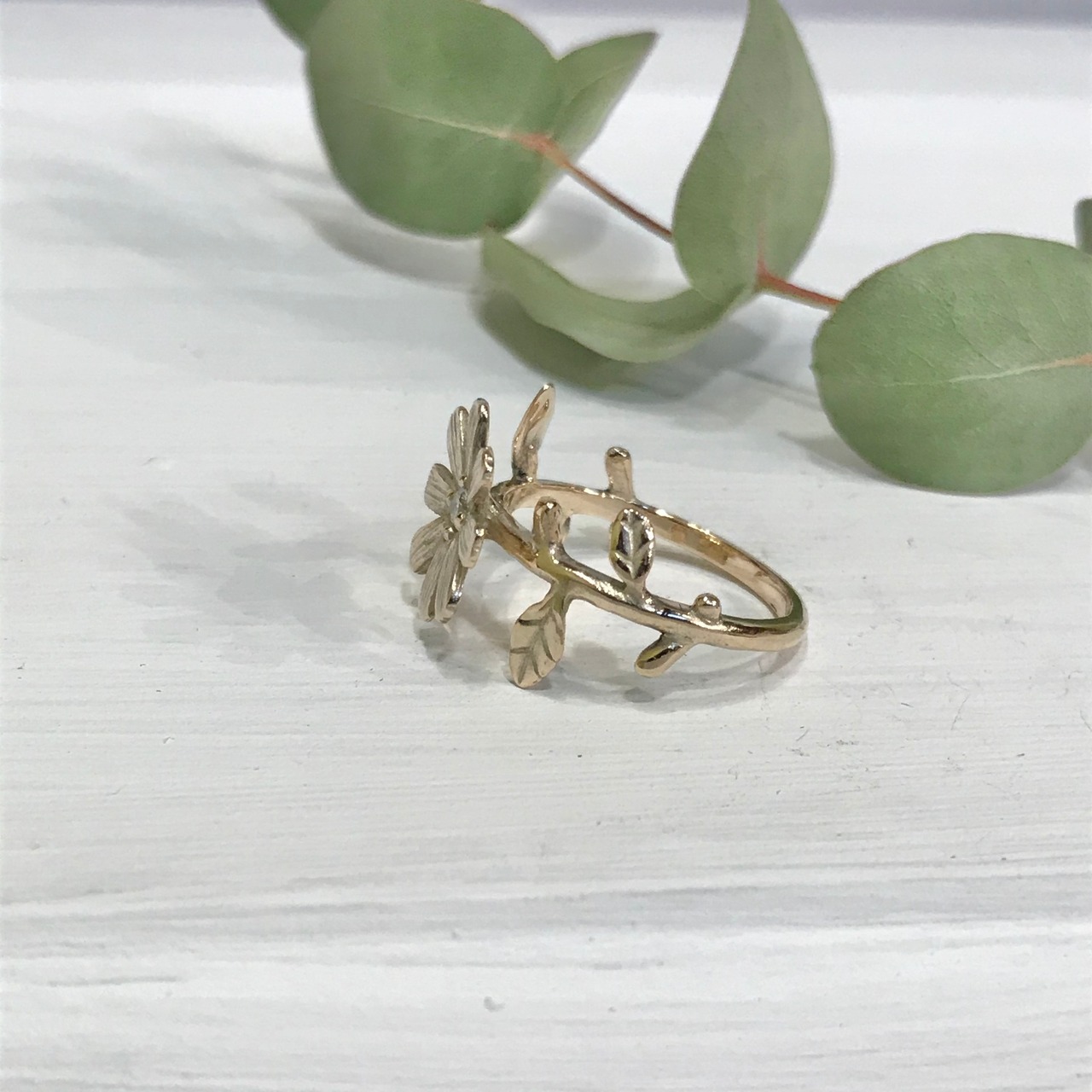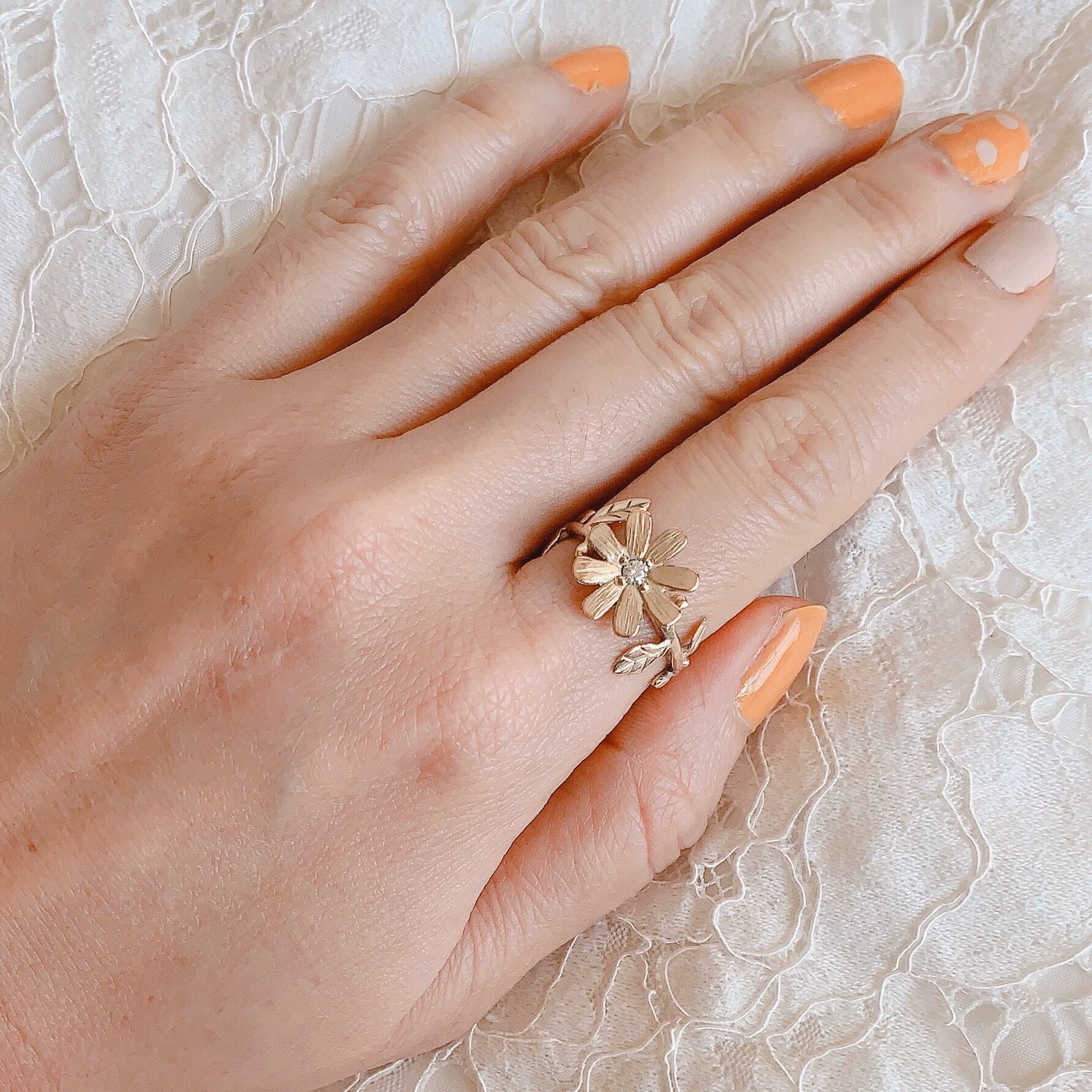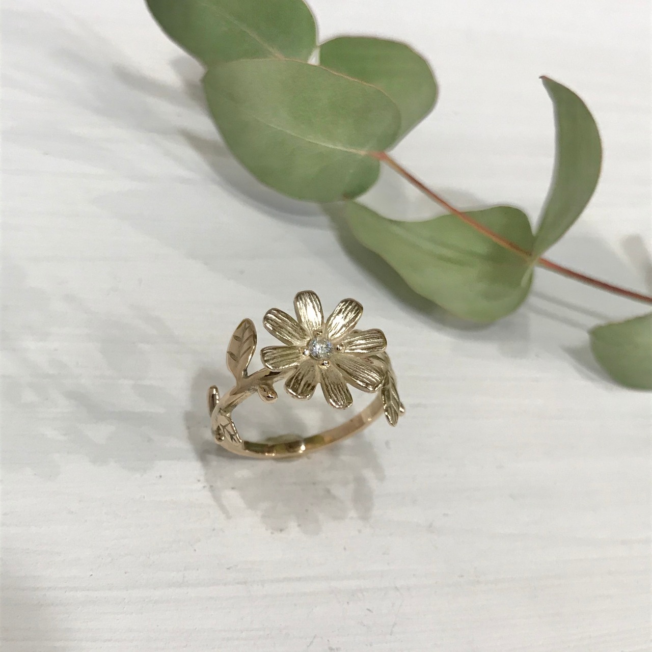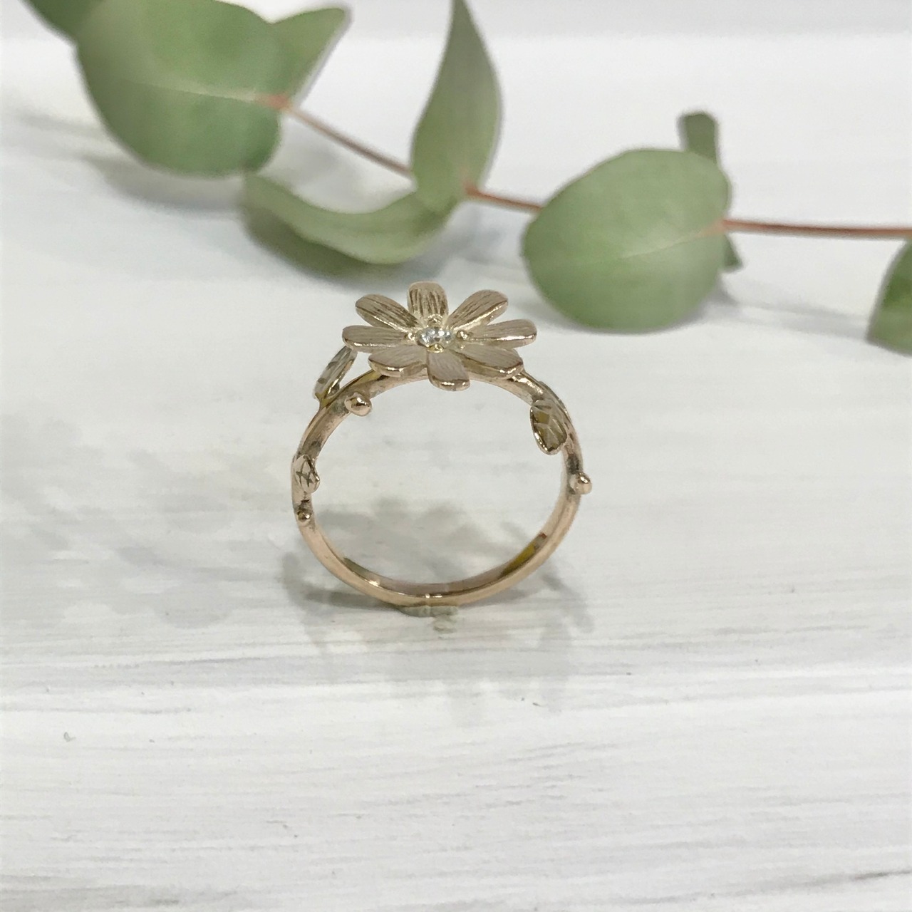 花の中心に普段使いしやすいボリュームのダイヤモンドをセットしました。